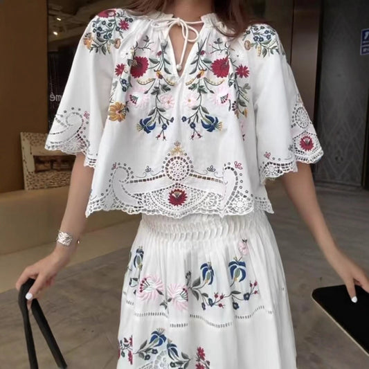 Embroidered Floral Hollow Out Tied Loose Round Neck Puff Sleeve Top