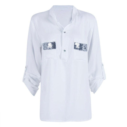 Solid Color And V-neck Sequined Pocket Shirt Loose Long Sleeve Shirt