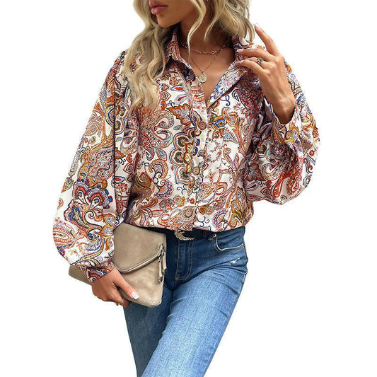 Printed Women's Long Sleeve Lapel Button Ladies Shirt