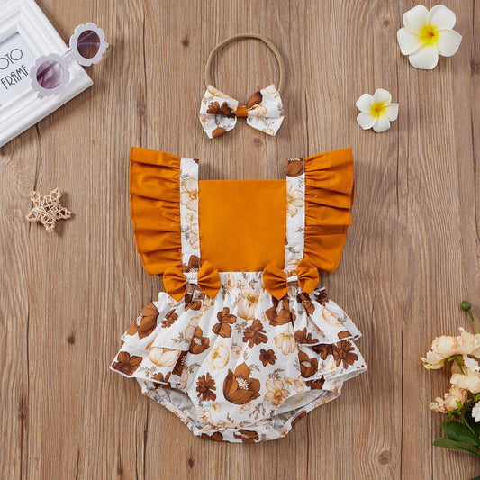 Ins Popular Baby Flounced Sleeve Suit Printed Top Blouse And Pants Headscarf Three-piece Suit