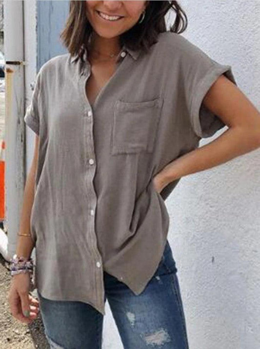 Solid Color V-Neck Lapel Short-Sleeved T-Shirt - Women's Summer Loose Top