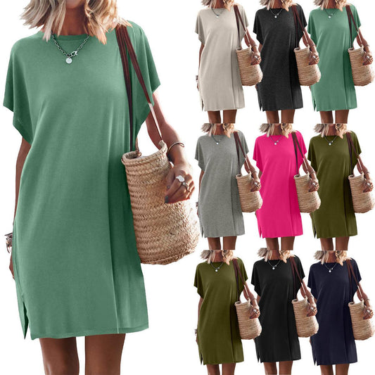 Women's Batwing Sleeve Solid Color Crew Neck Split Casual Dress