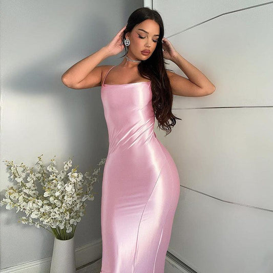 Solid Color Style Satin Sling Mid Split Dress Women