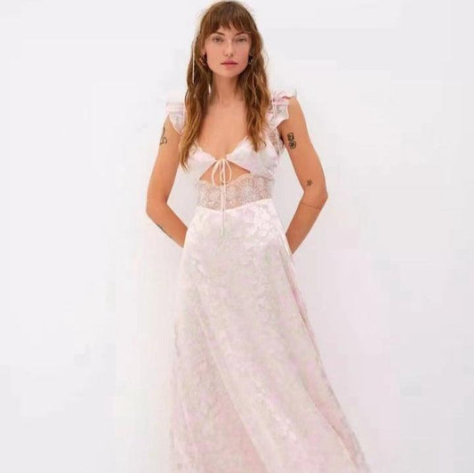 European And American Style Lace Backless Flying Sleeves Shoulder Strap Stitching Slit Color Length Dress