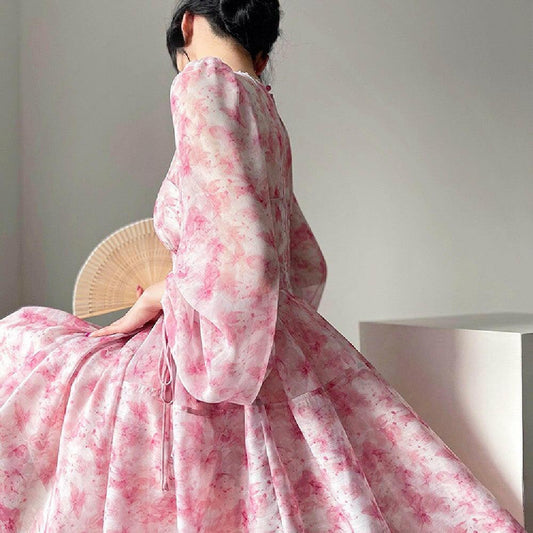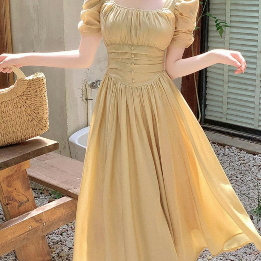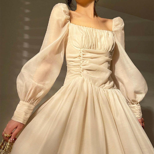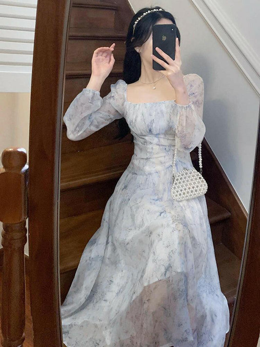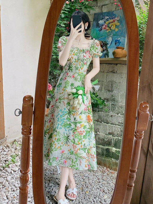 Retro Floral Square Neck Temperament High Sense Ladies Dress