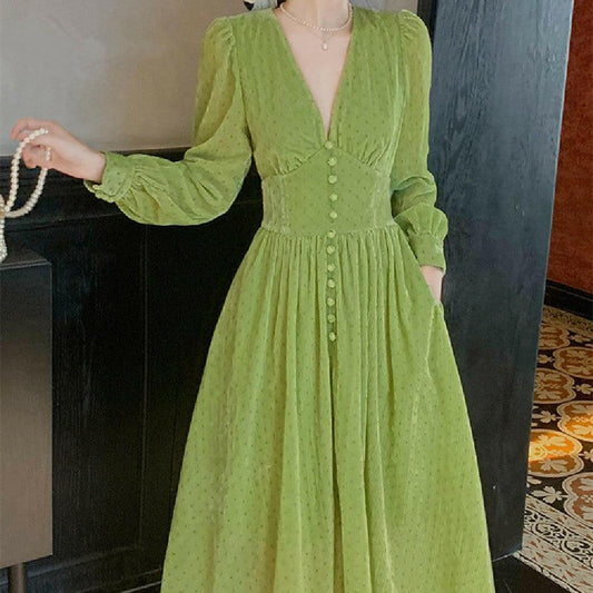 Retro Slim Waist Light Mature Temperament Green Floral Dress Women