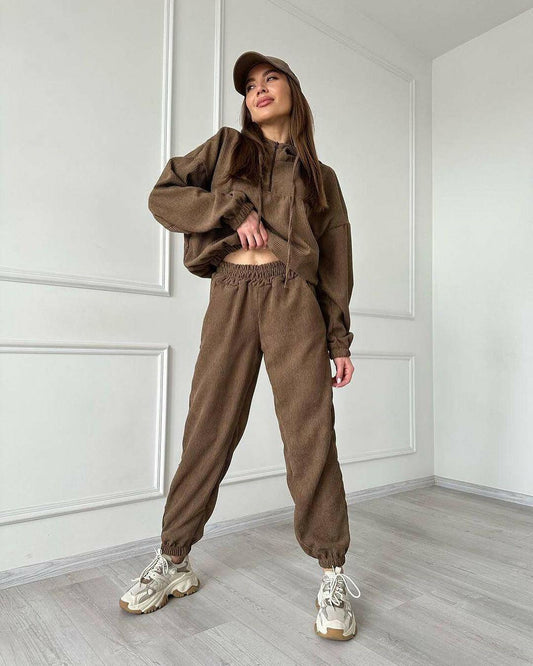 Modischer minimalistischer Langarm-Hosenanzug mit Kapuze und Reißverschluss für Damen