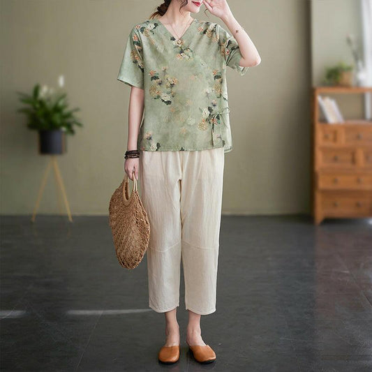 Damen Modisches Retro-gesticktes chinesisches Knoten-Knopf-Kurzarm-Top mit V-Ausschnitt