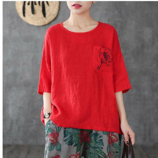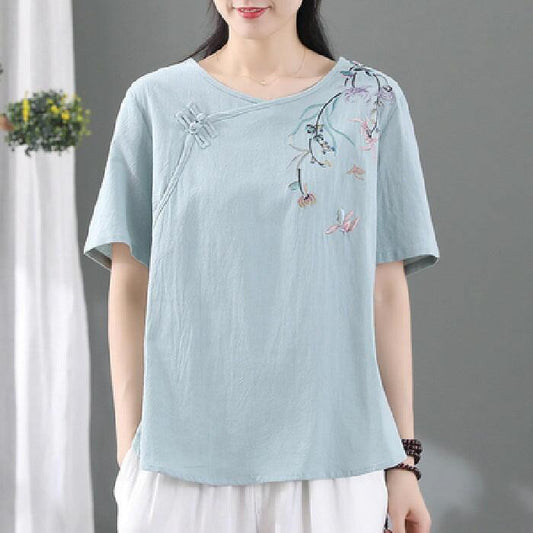 Modisches, lässiges, besticktes Damen-T-Shirt aus Baumwolle und Leinen