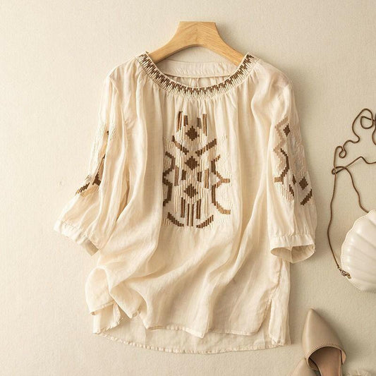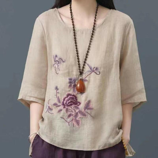 Modisches, schlankmachendes Damenoberteil aus Baumwolle und Leinen mit Rundhalsausschnitt und Stickerei