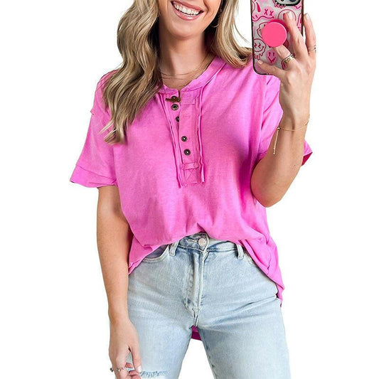 Damenmode-T-Shirt mit Retro-Chinesischer Knoten-Knopf-Stickerei und V-Ausschnitt