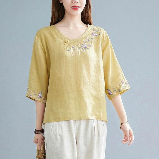 Modisches, schlichtes, besticktes Ramie-Hemdoberteil für Damen