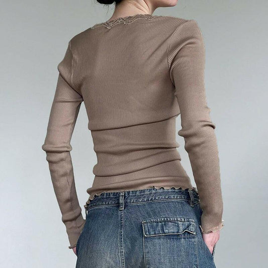 Geripptes, schmal geschnittenes, langärmliges T-Shirt mit Spitze