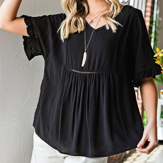 Einfarbiges und gerüschtes Puffärmelhemd mit V-Ausschnitt, europäischer und amerikanischer Freizeitpullover