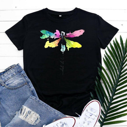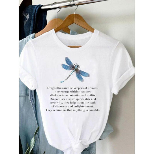 Damenmode Lässiges Libellen-bedrucktes Rundhals-Kurzarm-T-Shirt-Oberteil