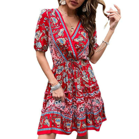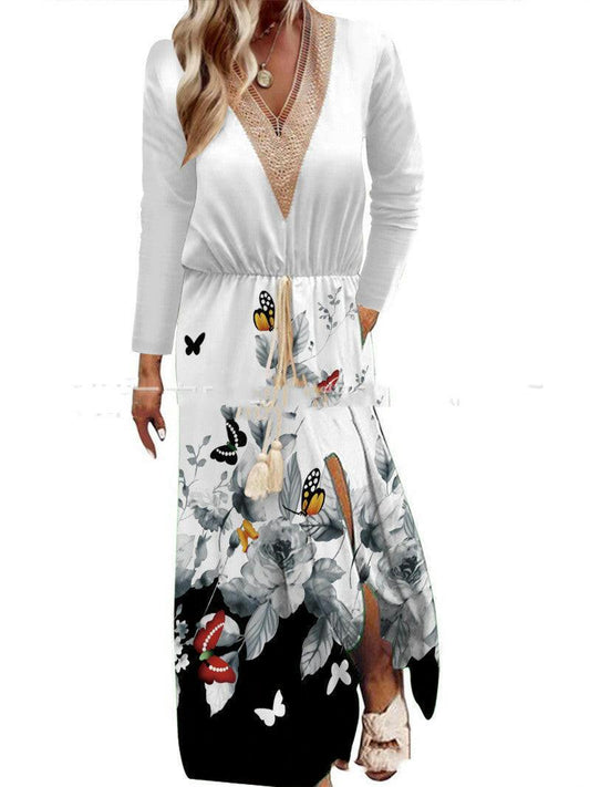 Frühlings- und Sommerdruck-Langarmkleid Spitzenkleid mit V-Ausschnitt und Taille