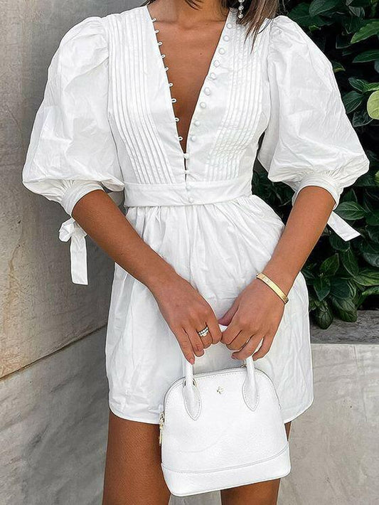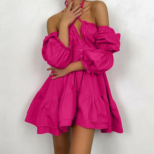 Modischer, einfarbiger A-Linien-Rock mit Puffärmeln und Schnürung für Damen