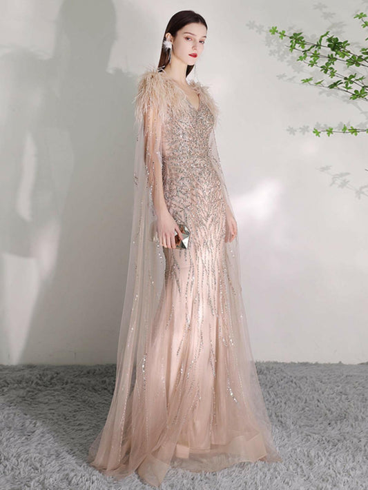 Champagnerfarbenes Abendkleid mit langen Ärmeln