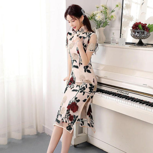 Verbessertes, besticktes Slim-Fit-Cheongsam-Retro-Cheongsam-Kleid aus Voile mit Stehkragen und kurzen Ärmeln