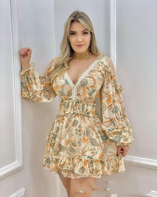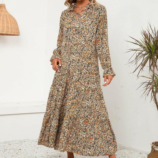 Modisches bedrucktes Laternenkleid mit langen Ärmeln und V-Ausschnitt und Neckholder-Nähten