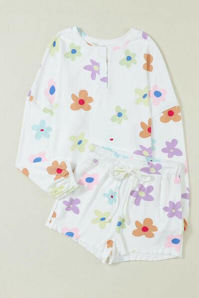 Printed Quarter Button Top and Drawstring Shorts Lounge Set