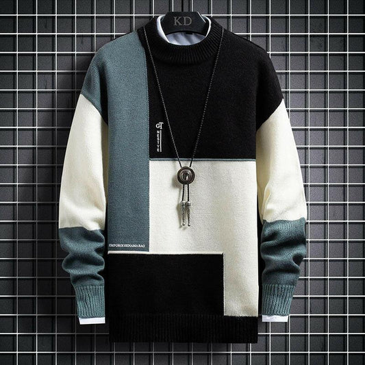 Neuer dünner, farbblockierender Rundhalspullover für Herren, lässiger Pullover