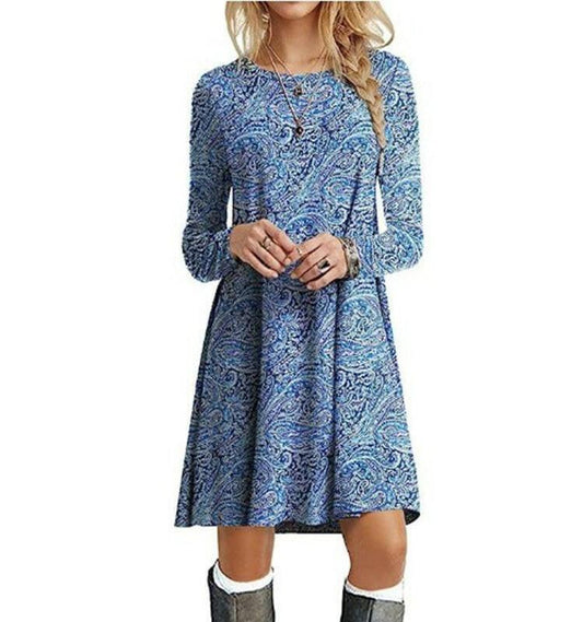 Lässiges, langärmliges Urlaubskleid mit Rundhalsausschnitt und Blumendruck