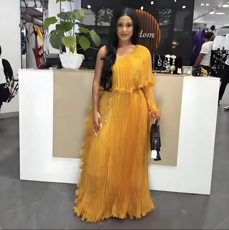 Make a stunning entrance with this Fashionable One-Shoulder Elegant Evening Dress, designed for women who appreciate chic minimalism and sophisticated silhouettes. Featuring a stylish asymmetrical one-shoulder neckline, a flattering high-waist design, and a flowing long skirt, this dress delivers refined elegance perfect for evening events, parties, weddings, and formal occasions.