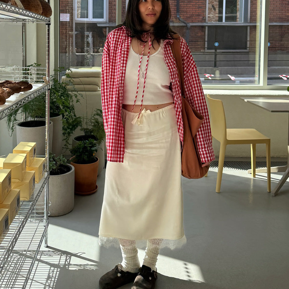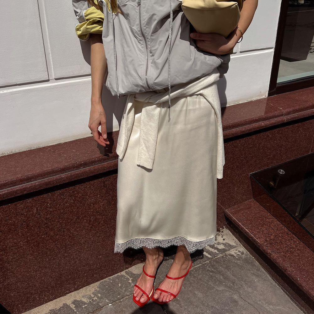 French Lace Stitching Satin Skirt Sexy Solid Color High Waist Slim Fit