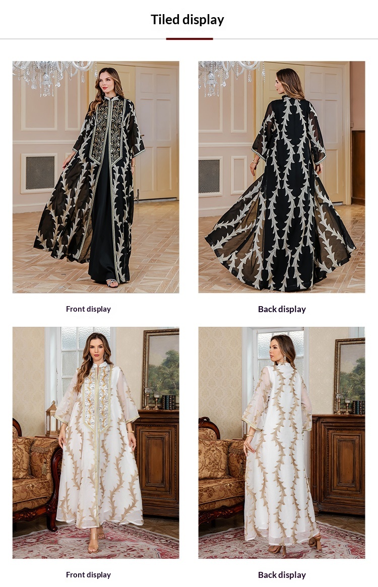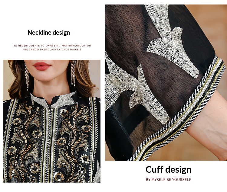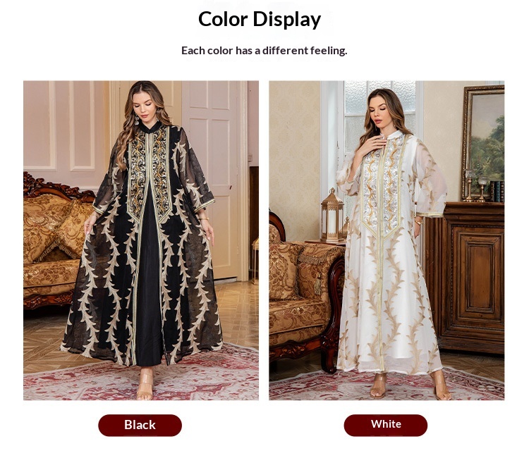 Available in classic black and white, this embroidered long dress is a versatile wardrobe essential that transitions effortlessly from formal dinners to special occasions.