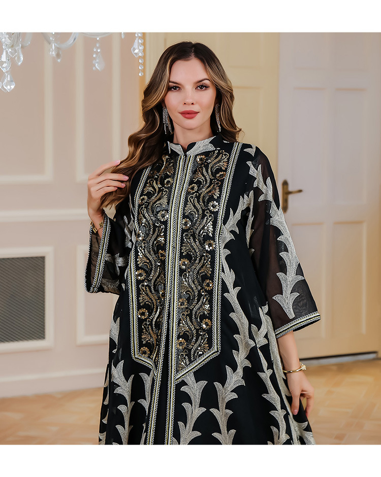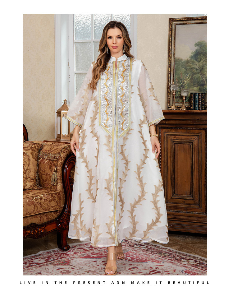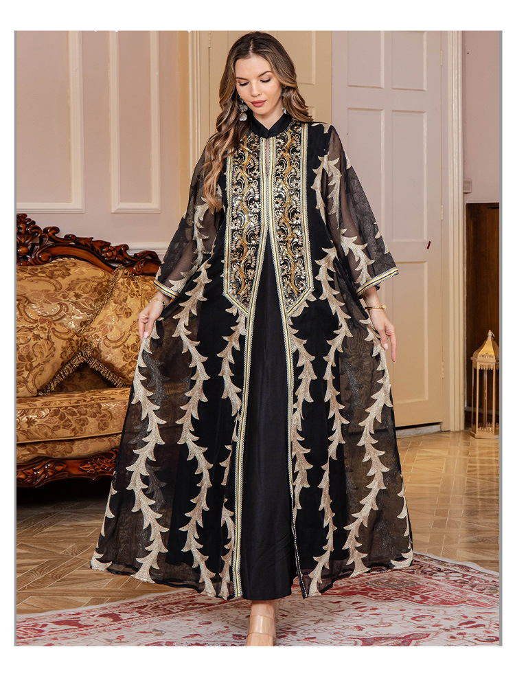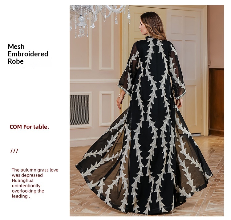 The regular fit silhouette offers comfort without compromising elegance, while the long sleeves and floor-length skirt create a graceful, elongated look suitable for formal occasions. The breathable mesh base combined with detailed embroidery makes this dress ideal for evening events, celebrations, and elegant gatherings.
