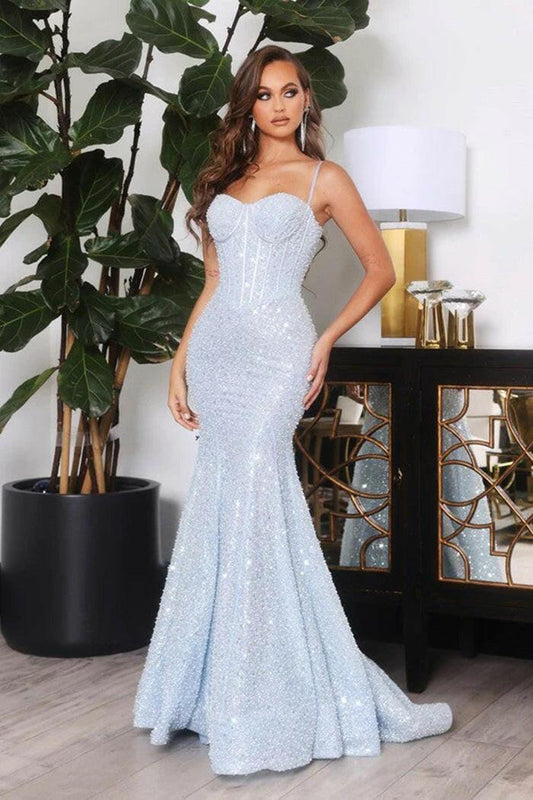 Robe de soirée à paillettes, décolleté en V profond, taille moyenne, col licou, bretelles spaghetti