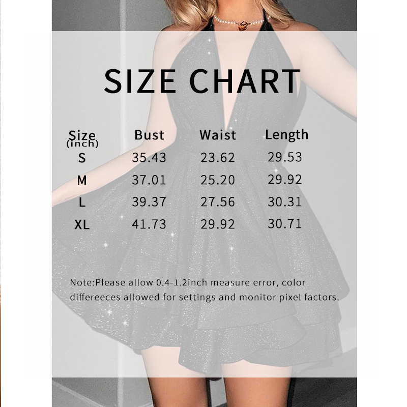 Shine bright all night in our stunning Sparkly Halter Mini Dress, designed to make you the center of attention. This dress masterfully combines daring sex appeal with playful elegance, featuring a deep V-neck halter top that elegantly frames the décolletage and ties behind the neck for an adjustable, secure fit. The dramatic open back design adds a touch of allure, while the playful ruffle accents create movement and a fun, flirty vibe.