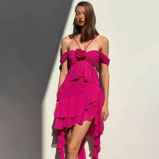 Summer Women Clothing Suspenders Sexy Cutout Irregular Asymmetric Design Floral Dress
