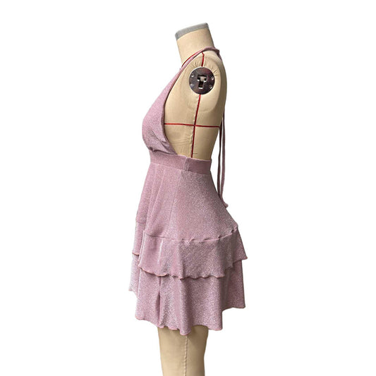 Women's Sparkly Halter Deep V Neck Backless Ruffle Sleeveless Sexy Mini Dress
