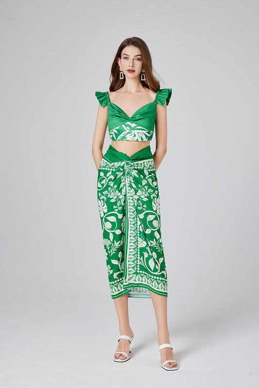Women's 2-Piece Summer Printed Suit - V-neck Halter Top and Pleated Short Skirt Set