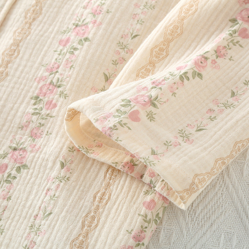 Crafted from breathable, skin-friendly cotton, this two-piece set features a lapel-front long sleeve top paired with full-length trousers, offering relaxed elegance for spring and autumn days. The literary-inspired floral and striped prints add a gentle, timeless charm perfect for slow mornings, cozy evenings, or casual outings.
