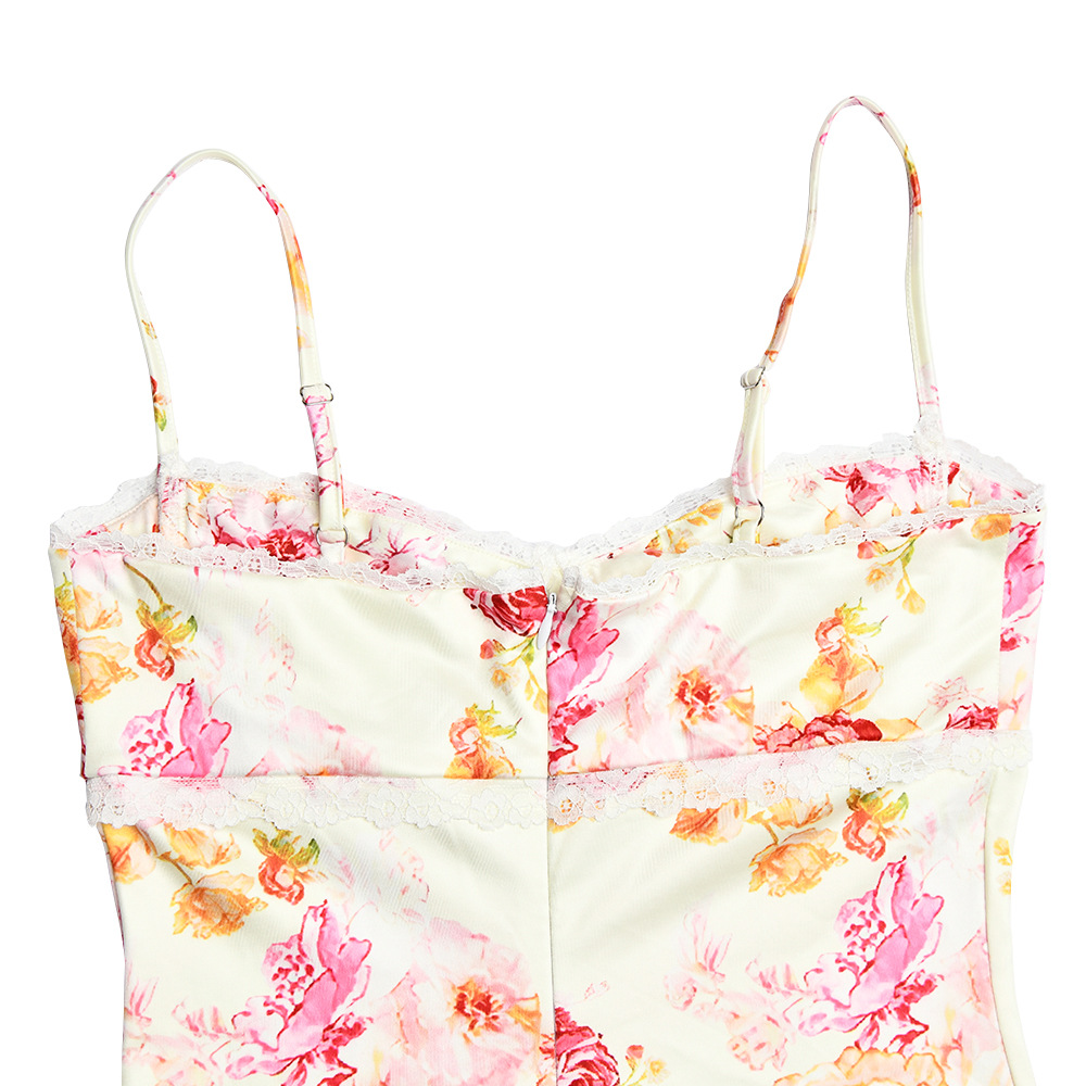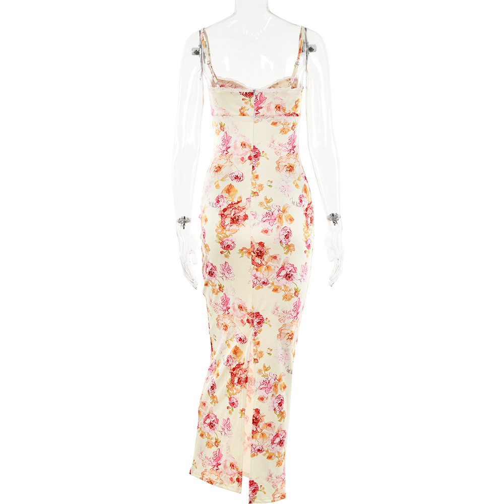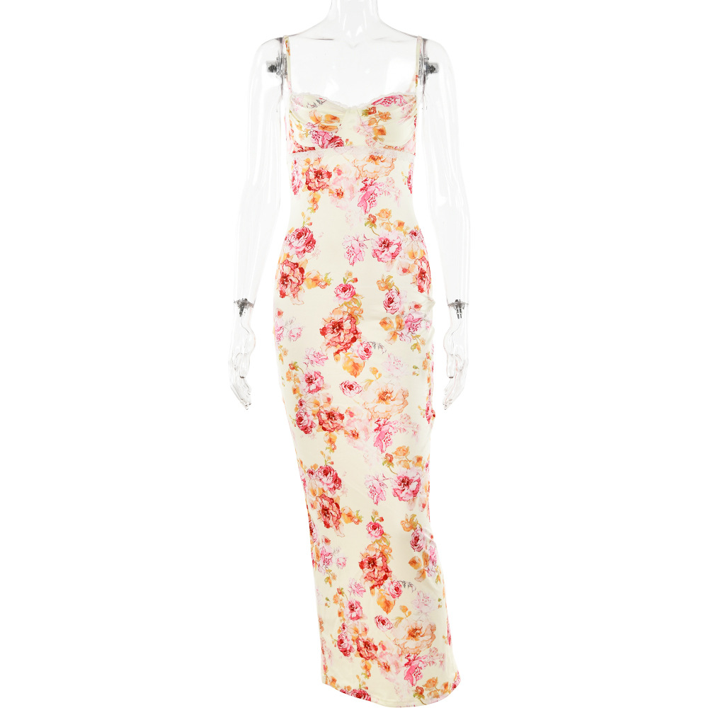 Retro Printing Slip Dress Women Sexy Backless Collar Waist Slimming Maxi Dress